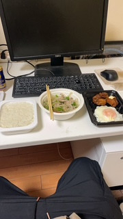 野菜炒めはもやしニラキャベツピーマンにんじんと細切れ肉ぶっ込んで塩コショウしただけですがめちゃ美味かったです!
